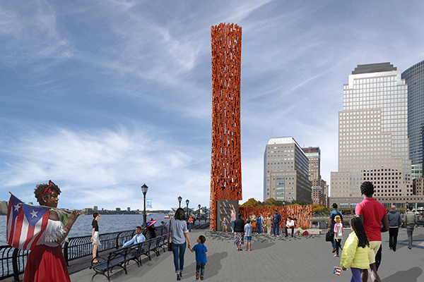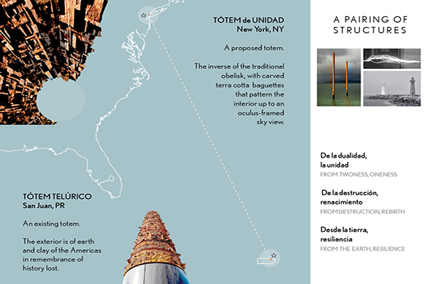 One of the unforeseen results of Hurricane Maria has been a sense of unity created among disparate groups of Puerto Ricans: survivors, victims’ families, individuals living in New York and across the world. Tótem de Unidad’s design is a tribute to that “oneness.” Crafted with Puerto Rican clay tiles, Tótem de Unidad is essentially born from the native soil. It also acts as a hinge connecting the two islands: A lattice arm reaches toward Puerto Rico; the shadow cast by the tótem extends back to NYC each sunset.