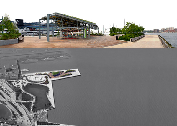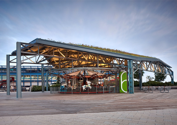 Staggered steel trusses provide cover for the carousel from direct sunlight, creating a darkened space and heightening the drama of the carousel color and lights. The roof orientation effectively engages the pier, the lawn and the pathways to the north. The wood decking of the pier extends along the ground into the pavilion, up onto the wall and ceiling surface — thus enforcing a material continuity between pavilion and pier. A green roof (planted with sedum and other local grasses) prevents water runoff into the Hudson River. Through these elements, the pavilion acts as a shelter, a backdrop and a convergence of landscape and building.