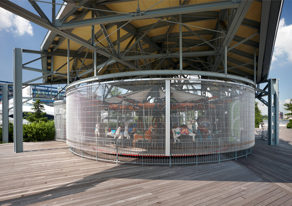 The carousel pavilion on Segment 5, Pier 62 is an architectural component of the landscape design comprising 8 acres of Hudson River Park — what has become the largest breadth of park along the Hudson River in Manhattan. The carousel enclosure is emphasized by an exposed structure and includes materials that recall the site’s warehouse past. It also provides a gradation of program from the romantic park setting to the nearby sports recreation spaces of Chelsea Piers.